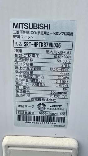 木城町石河内 三菱電機自然冷媒CO2家庭用ヒートポンプ給湯機 貯湯ユニットSRT-HPTK37WUDX6→コロナ自然冷媒CO2家庭用ヒートポンプ給湯機 ヒートポンプユニットCHP-DZ601K、貯湯ユニットCTU-46AZ1K エコキュート交換工事