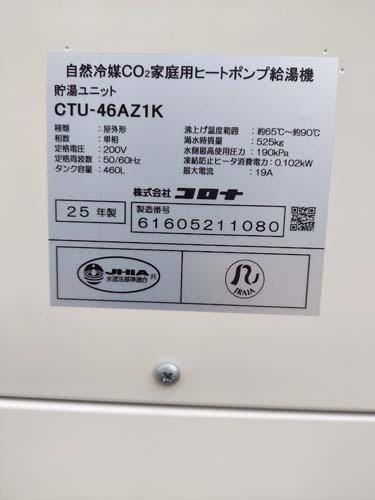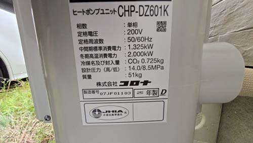 木城町石河内 コロナ自然冷媒CO2家庭用ヒートポンプ給湯機 ヒートポンプユニットCHP-DZ601K、貯湯ユニットCTU-46AZ1K エコキュート交換工事